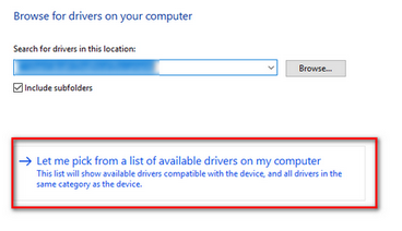 - A new window will come forward where you will be asked to specify the location of the drivers. Select the option at the bottom of the screen which says “Let me pick from a list of available drivers on my computer”.