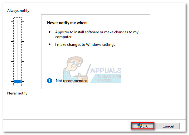 - In the User Account Control Settings window, tone down the slider to Never notify and hit Ok.