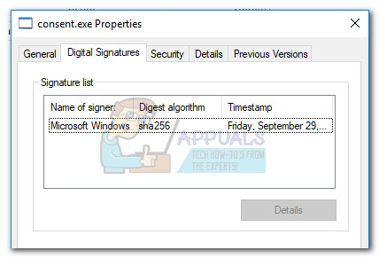 If the revealed location is C:\ Windows \ System32 folder, you can probably assume that the process is legitimate. But if you want to be extra sure, right-click on the executable and choose Properties. Inside the Properties window, access the Digital Signatures tab and see whether the Name of signer is listed as Microsoft Windows. If it’s indeed signed by Microsoft, you’ve just determined that the file is indeed legitimate.