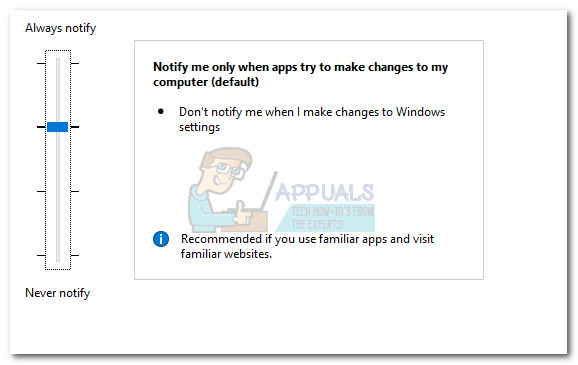 If restarting the catalog database didn’t work, you can bypass the consent.exe functionality by temporarily disabling the User Account Control. This will allow you to install, uninstall or reinstall any non-Windows software that was previously failing. Just remember to re-enable UAC after you complete the installation.