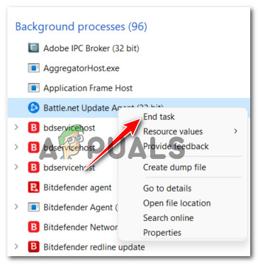 - Inside the list of processes, see if the Battle.net agent or Battle.net Update agent are running. If any of them are currently running, right-click and choose End Task from the menu.