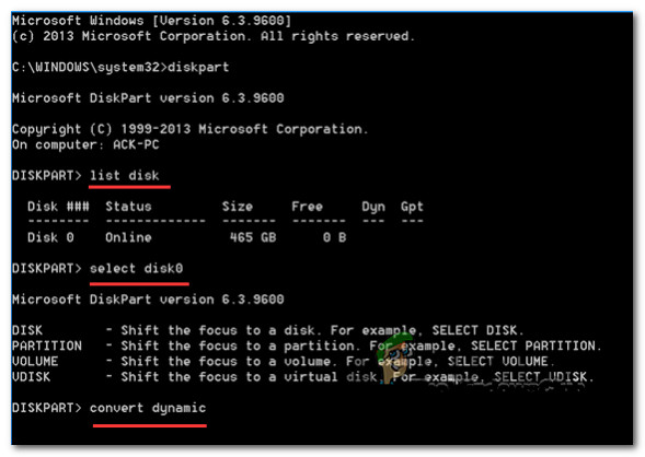 - Once you’re inside the elevated Command Prompt window, run the following commands in the same order as below and press Enter after each one to convert your basic disk to dynamic: