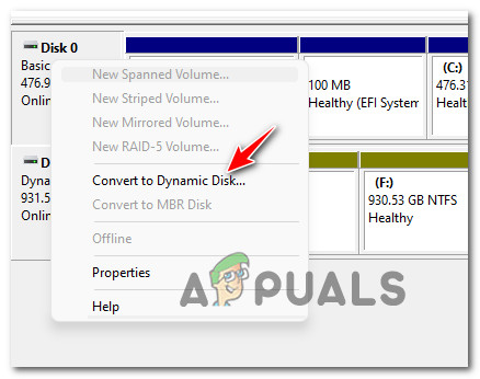 - Once you’re inside the Disk Management interface, select the basic disk that you want to convert to dynamic from the bottom-side menu, right-click on it and choose to Convert to Dynamic disk from the context menu that just appeared.