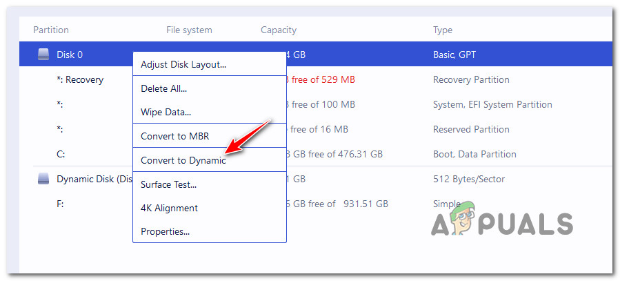 - Inside EaseUs Partition Master, simply right-click on the basic disk that you want to convert and choose Convert to Dynamic from the context menu that just appeared.