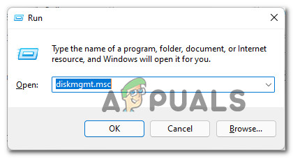- Press Windows key + R to open up a Run dialog box. Next, inside the text box, type ‘diskmgmt.msc’ and press Enter to open up Disk Management.