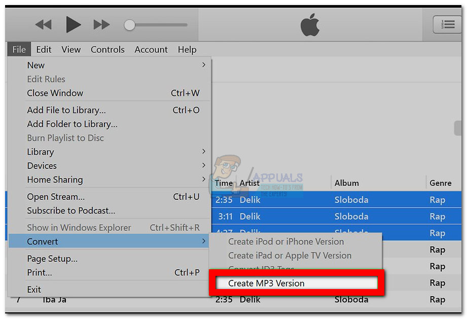- Open iTunes, click the File tab and choose Convert > Create MP3 Version.