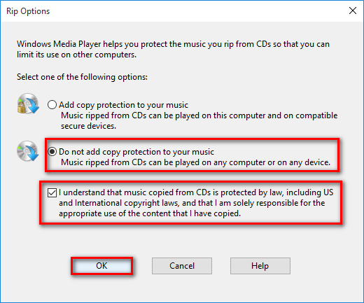 - You’ll then see a Rip Options prompt. If you want to make your converted MP3 files playable across multiple computers, select Do not add copy protection to your music and then check the checkbox down below. Hit Ok to kickstart the conversion process.