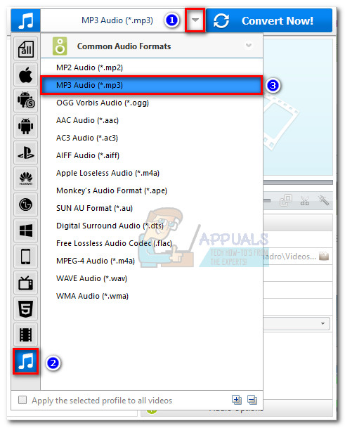 - Next, use the drop-down menu near the Convert Now! button, click on Common Audio Formats and select MP3 Audio (*.mp3) from the list.