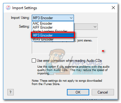 - In the Import Settings window, set the drop-down menu associated with Import Using to MP3 Encoder. Then, hit OK to save your changes.