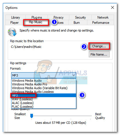 - In the Options menu of Windows Media Player, select the Rip Music tab. Firstly, use the Change button under Rip music to this location to set the location in which the converted MP3 files will be delivered. Once the location is set, click the Format drop-down menu (under Rip Settings) and set it to MP3. Finally, hit the Apply button to save your changes.