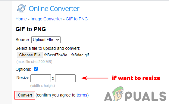 Uploading GIF file to the online site - You can also check the Option for resizing the GIF while converting. If not, just click on the Convert button to upload the GIF file and convert it to PNG.
