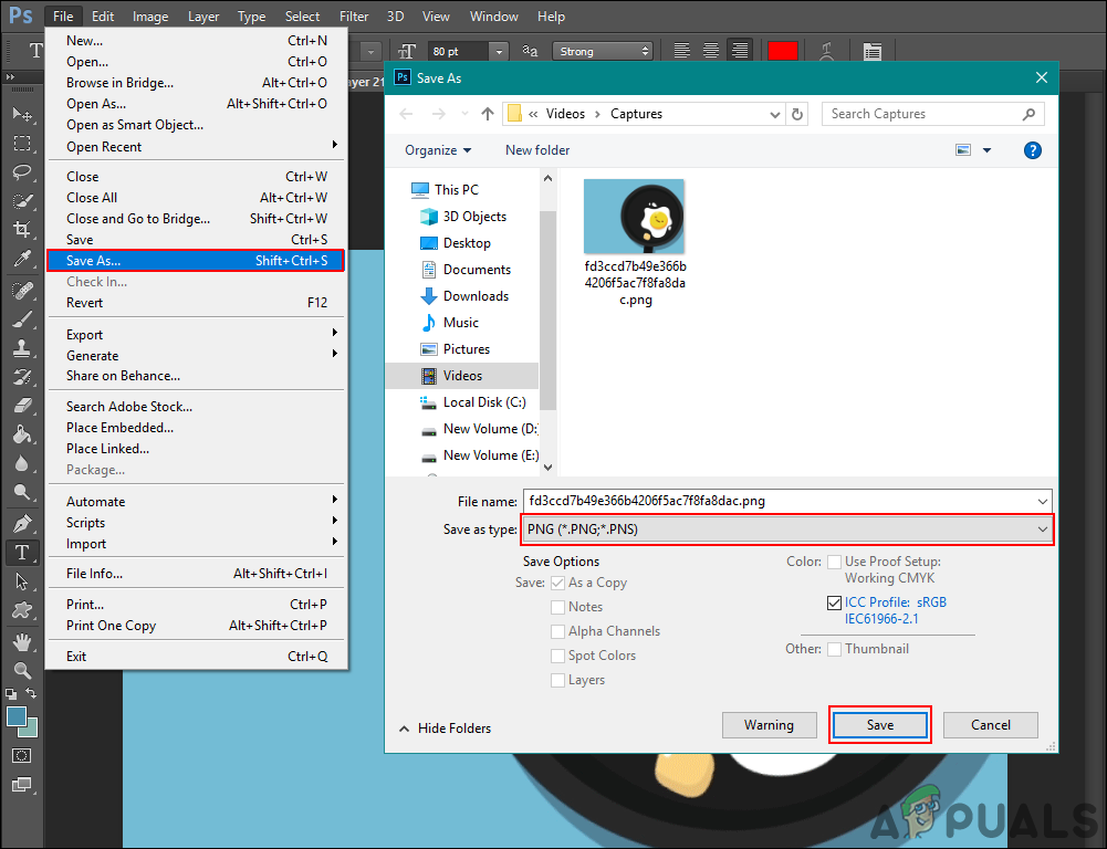 Exporting the frame as PNG - You can also click the File menu and choose Save As option. Here you just need to provide the file format as PNG to save it.