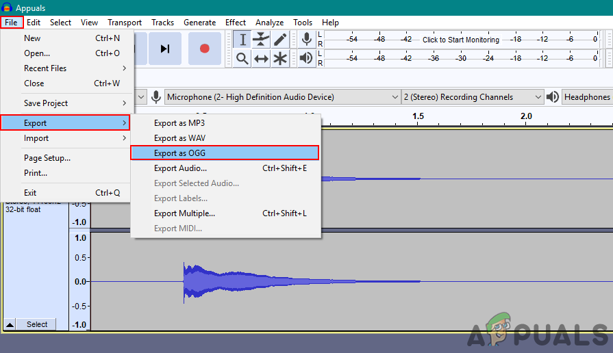 Opening the MP3 file in Audacity - Now click on the File menu again, select the Export option and choose Export as OGG option in the list.