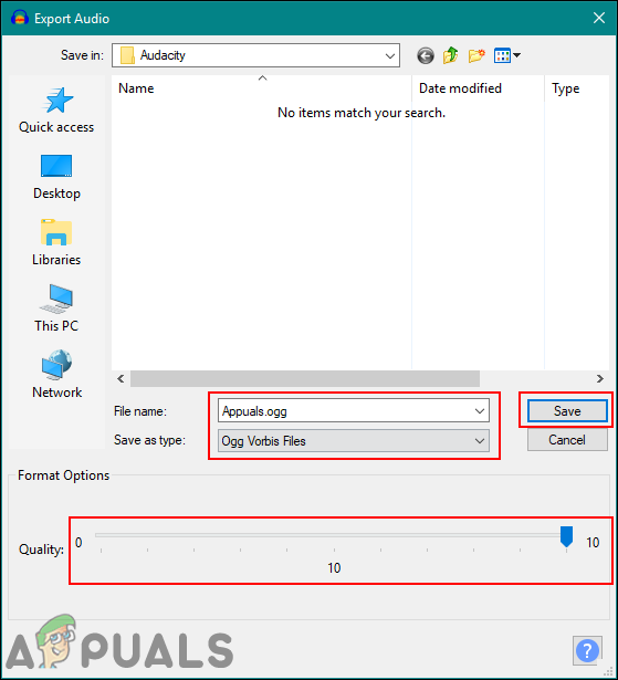 Exporting audio file as OGG - Provide the name of the file and choose the quality at the bottom. Click on the Save button to save the MP3 file as an OGG.