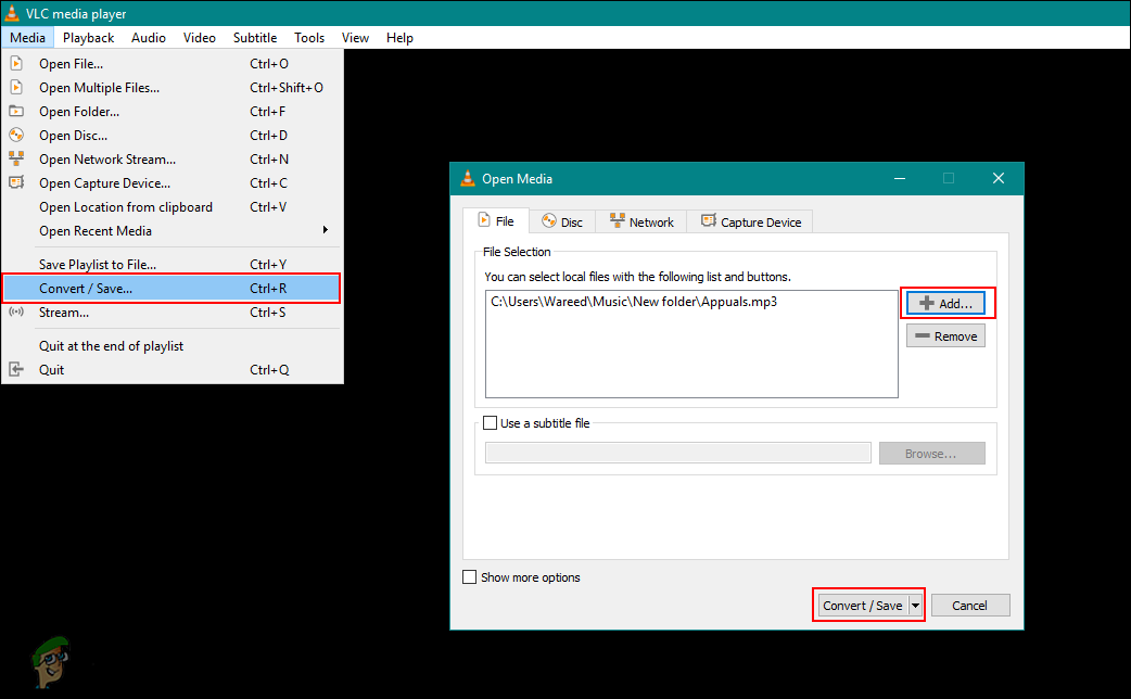 - Click on the Add button and select the MP3 file that you want to convert. Click on the Convert / Save button after selecting the file.