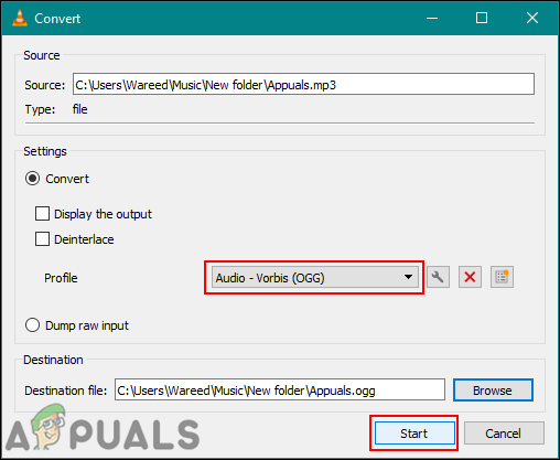 Using the conversion feature of VLC - Now in the Profile, select the Audio – Vorbis (OGG) option and provide the destination location below. Once you do that, click on the Start button to start the conversion of MP3 to OGG.