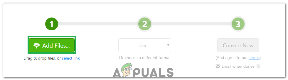 Selecting the “Add Files” button - Under Step 2, click on “Convert files to” and scroll down until you see the doc. Click it when you see it.