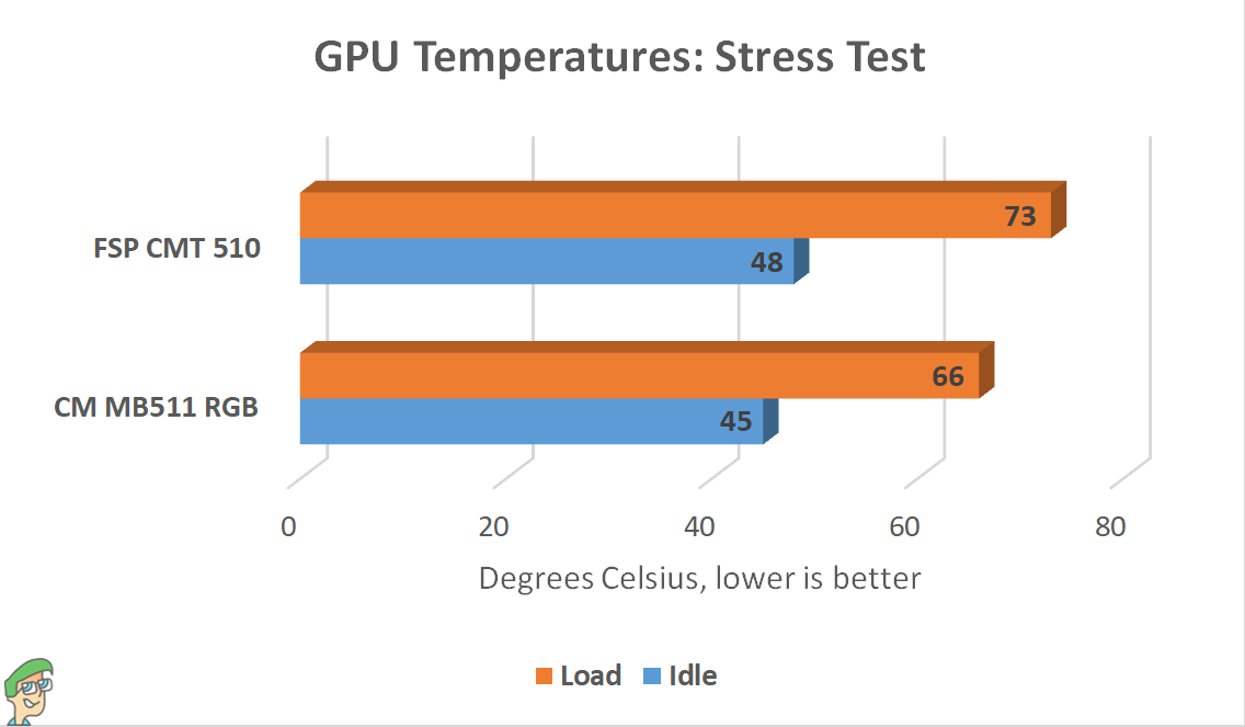 Our GPU temperatures show similar results in line with our system stress test, the MB511 is ahead of the CMT 510 substantially.