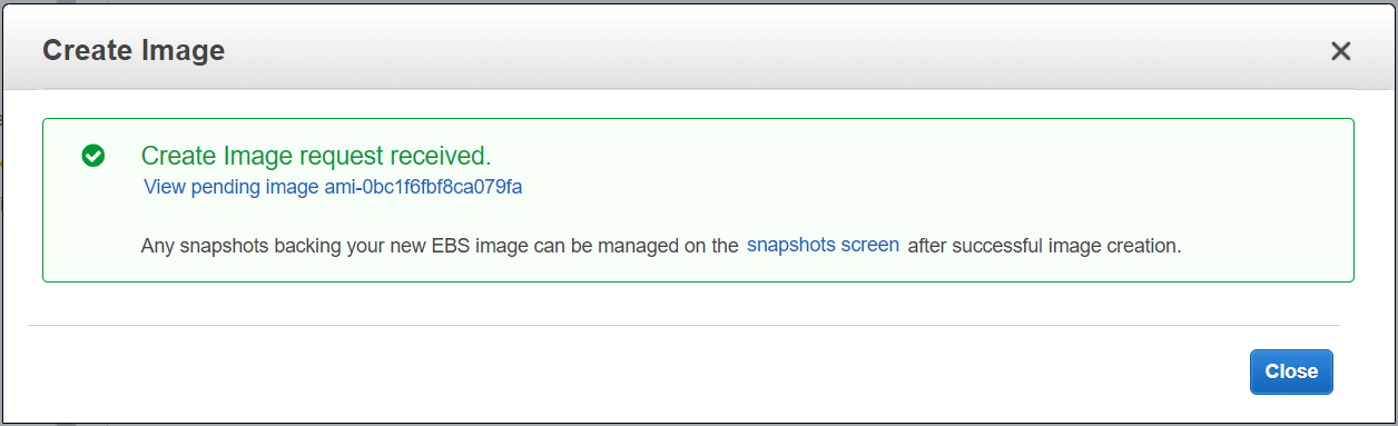 - Create an Image request received. It will take a few minutes until it is created and available. Click on View pending image ami-xxxxxxxxx.