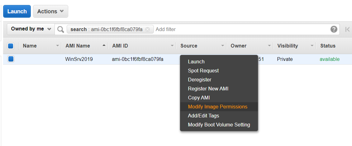 - Once it is available, right-click on the AMI image and then click Modify Image Permissions.