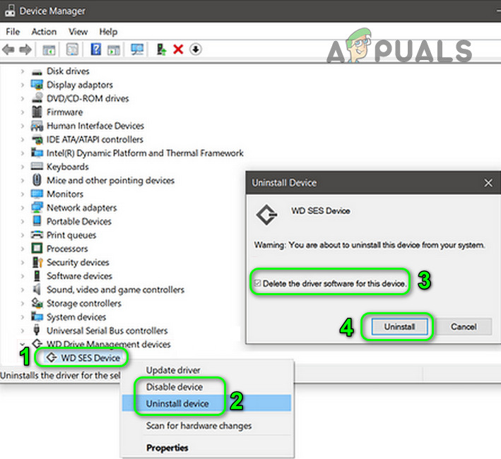 Disable and Uninstall the WD Ses Device - Now uninstall all the WD devices (disabled in the last step) and when uninstalling, do not forget to check-mark “Delete the Driver Software of This Device.