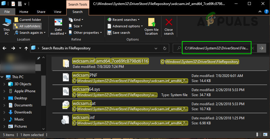 - Then search for wdcsam64_prewin8.sys in the File Explorer search (while This PC is selected) and delete all the files brought out by the search.
