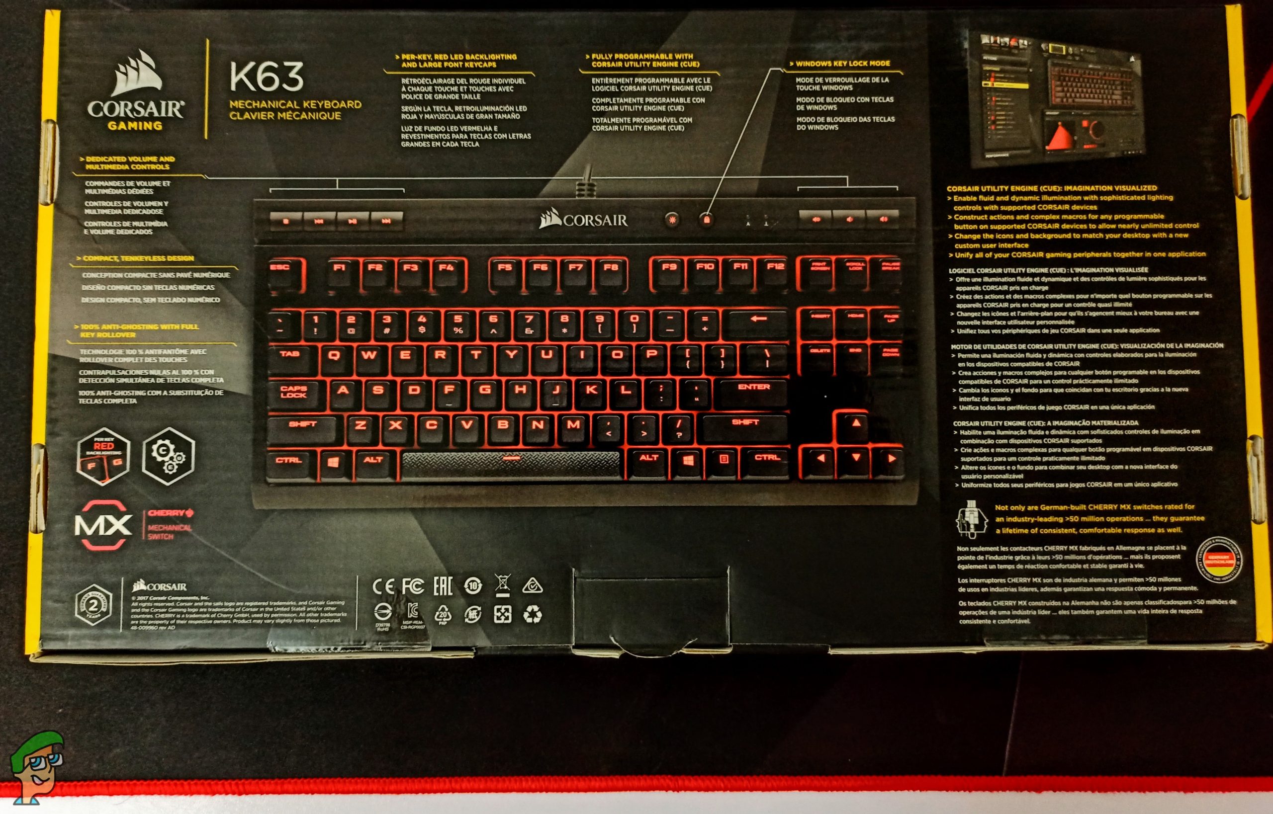 The box of the CORSAIR K63 is pretty similar to other keyboards from the company. At the front, you can notice the picture of the keyboard, with the switch type at the top right.