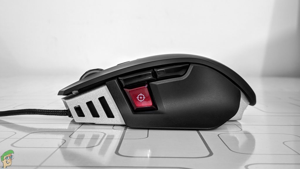 The hump in Corsair M65 RGB Elite is present at the backside prominently, which results in the claw-shaped design. The right side of the mouse is pretty flat and there are barely any curves while the left side has a huge curve down the line. We really appreciate this design because this curve helps the thumb get a fixed placement. The large red button might irritate you in the start but one can easily get accustomed to it in a few hours. The right and left-click areas form a very slightly concave shape, which is, at least, better than nothing.