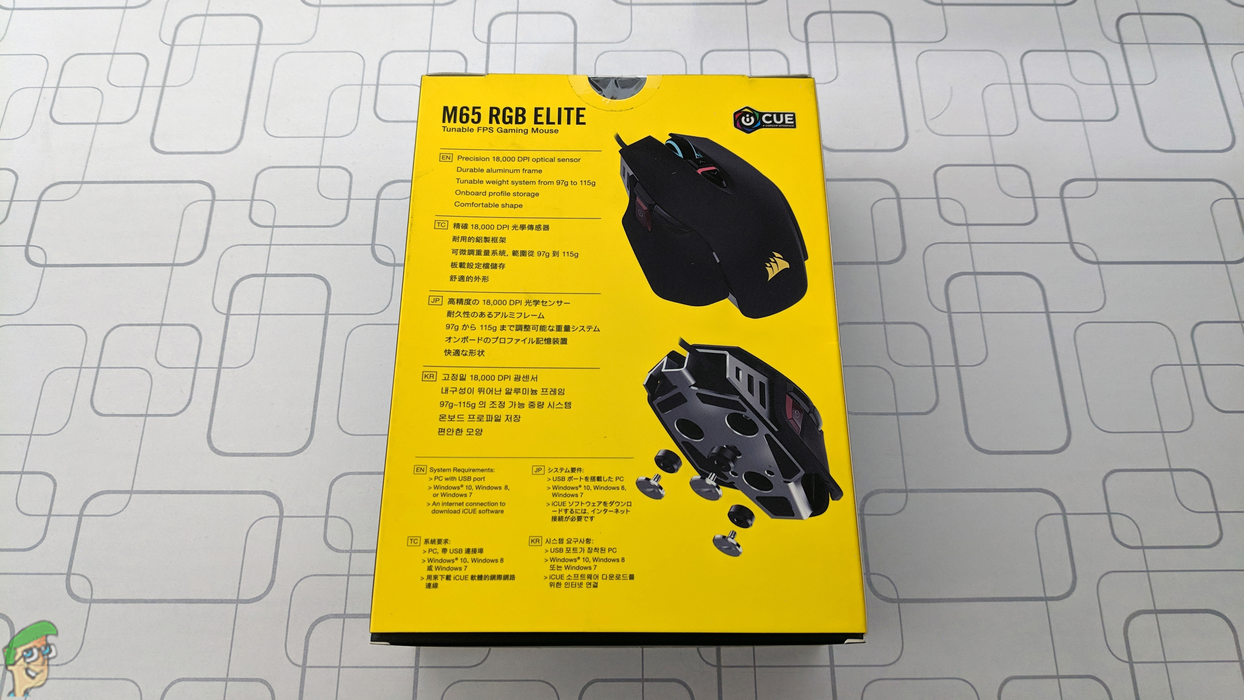 The back of the box provides the basic specifications of the mouse in four different languages, such as the DPI, weight system along with the system requirements. The figure of the mouse provides some insight into the weight system of the M65 RGB Elite which we will cover in detail as well.