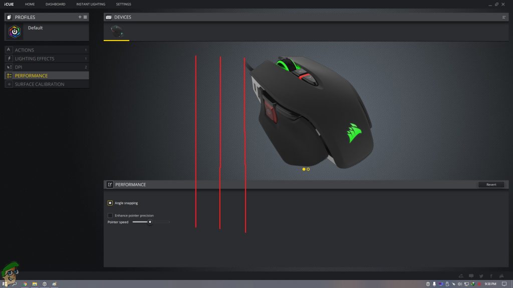 In the performance tab, you will be able to control two features, “Angle Snapping” and the “Enhance Pointer Precision”. We have tested the functionality of Angle Snapping by drawing three red lines with various cursor speeds(in the picture below). We noticed that the faster the movements are, the less effective is the angle snapping feature.