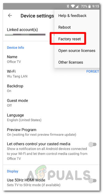 - Chromecast Settings — Another possible cause of the issue can be the Chromecast dongle itself. In some cases, your Chromecast settings can cause the issue to arise and prevent it from establishing a connection. This can be easily resolved by simply factory resetting the device.