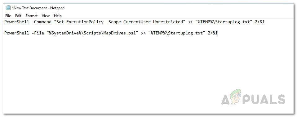 PowerShell -Command "Set-ExecutionPolicy -Scope CurrentUser Unrestricted" >> "%TEMP%\StartupLog.txt" 2>&1 PowerShell -File "%SystemDrive%\Scripts\MapDrives.ps1" >> "%TEMP%\StartupLog.txt" 2>&1