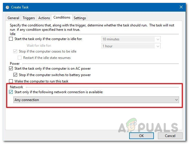 Task Conditions - Under Network, make sure the Start only if the following network connection is available option is checked.