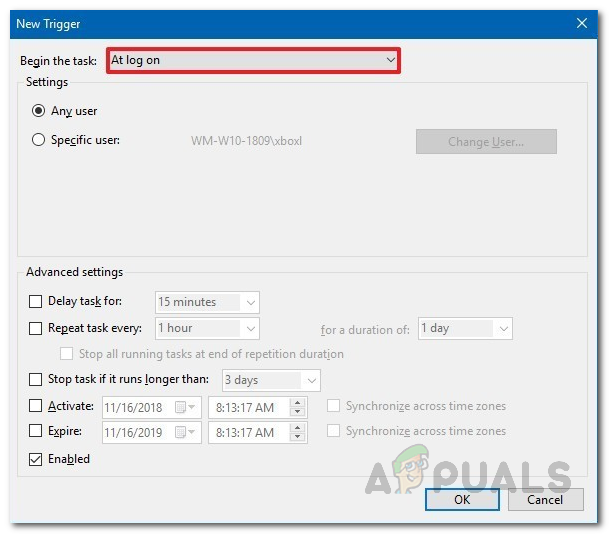 - For the Begin the task option, choose the At log on option from the drop-down menu. After that, click on the OK button.