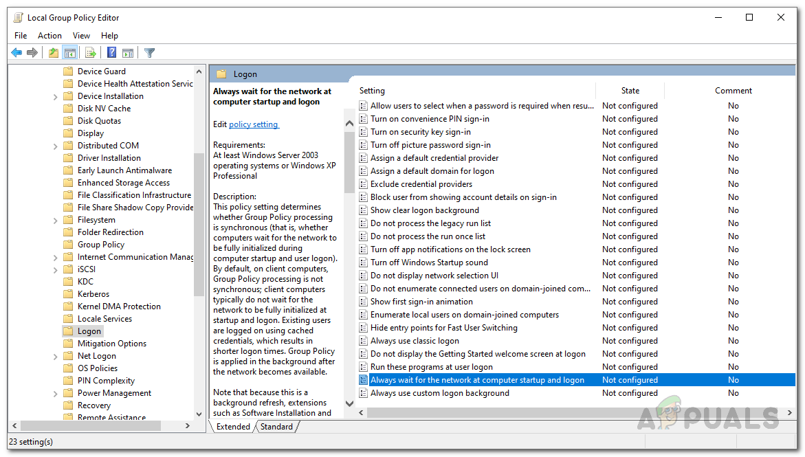 Like we have mentioned, the problem seems to occur when the system attempts to map the network drives before it is even available. Therefore, the first thing that you should do is make the Windows wait for the network before it tries to map the drives. For this, we will have to change the local group policy a bit.