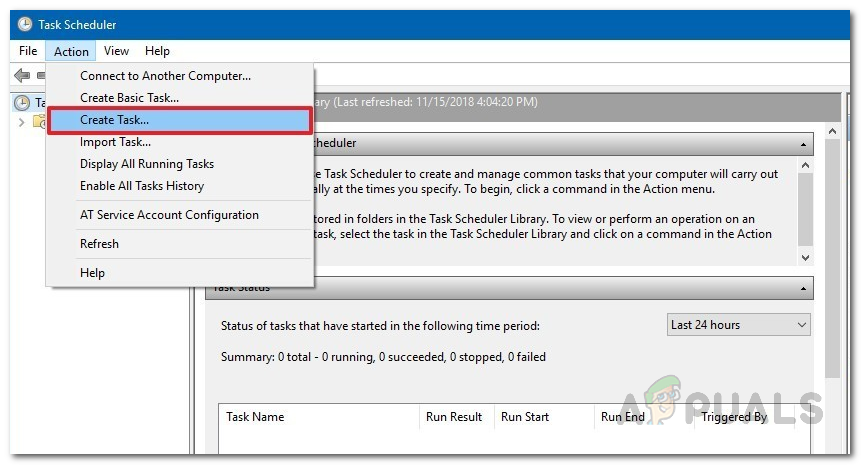 - Once you have launched the Task Scheduler, you will have to create a task. To do so, click on the Action drop-down menu and then click the Create Task option.