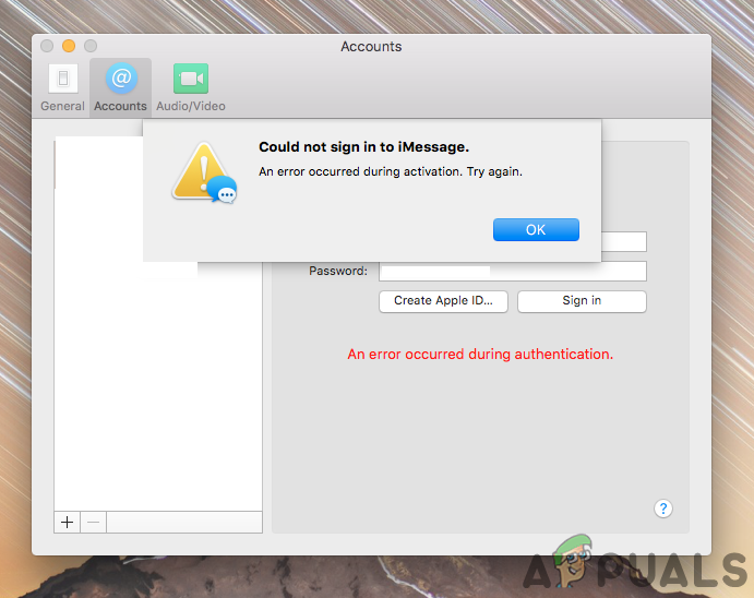 This issue is usually triggered when there is an internet outage at the user’s end or service disruption on Apple’s end. When this error message appears, the user is unable to use iMessages entirely even if he was logged in earlier. In some cases, issues with NVRAM of the computer or interference from third-party applications might cause the error message.