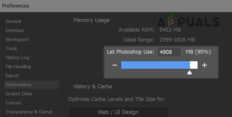 Increase Memory Usage of the Adobe Photoshop - Now apply the changes and relaunch Adobe Photoshop to check if Adobe Save for Web is working fine.