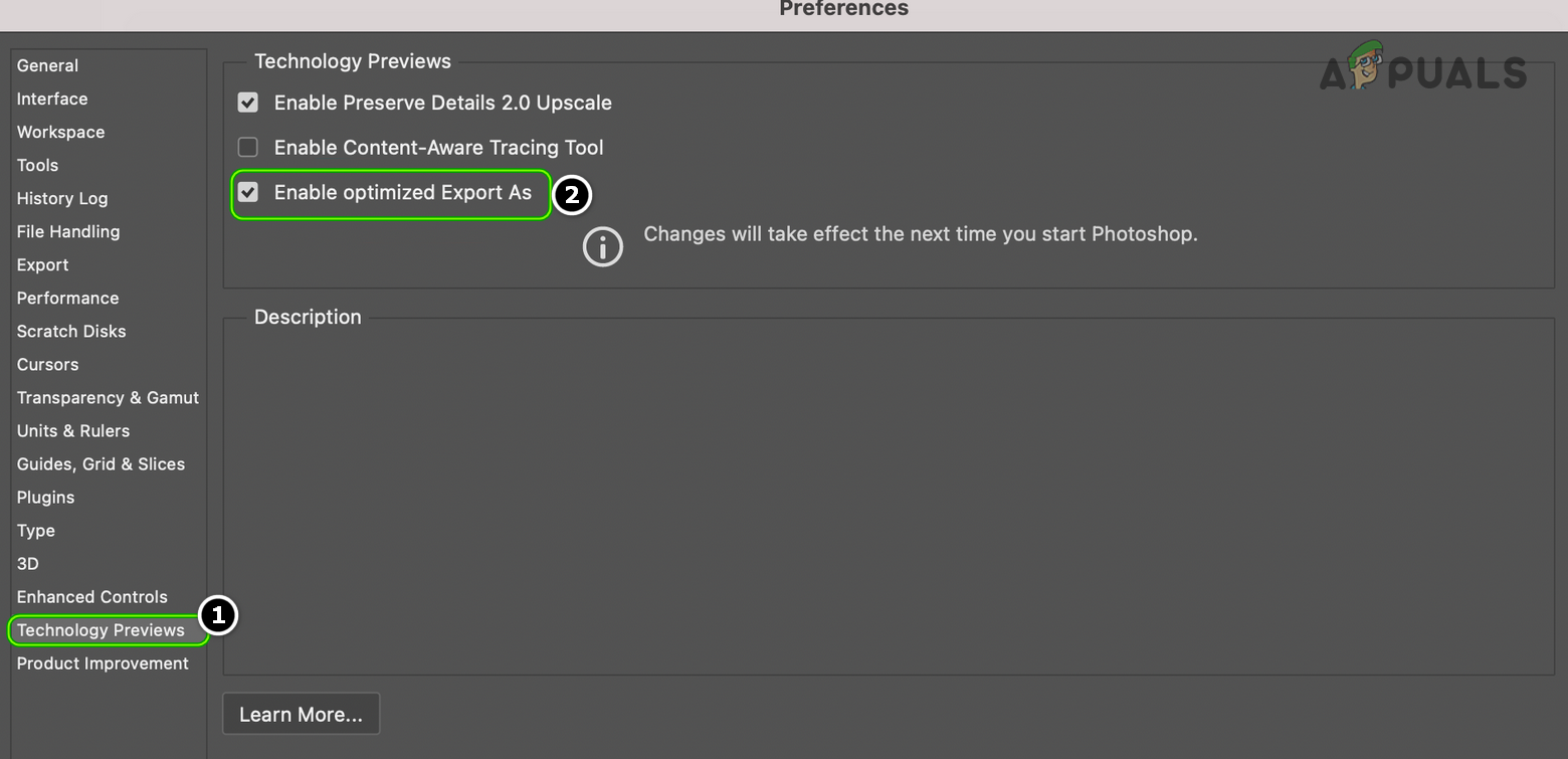 Enable Optimized Export as Technology Previews of the Adobe Photoshop