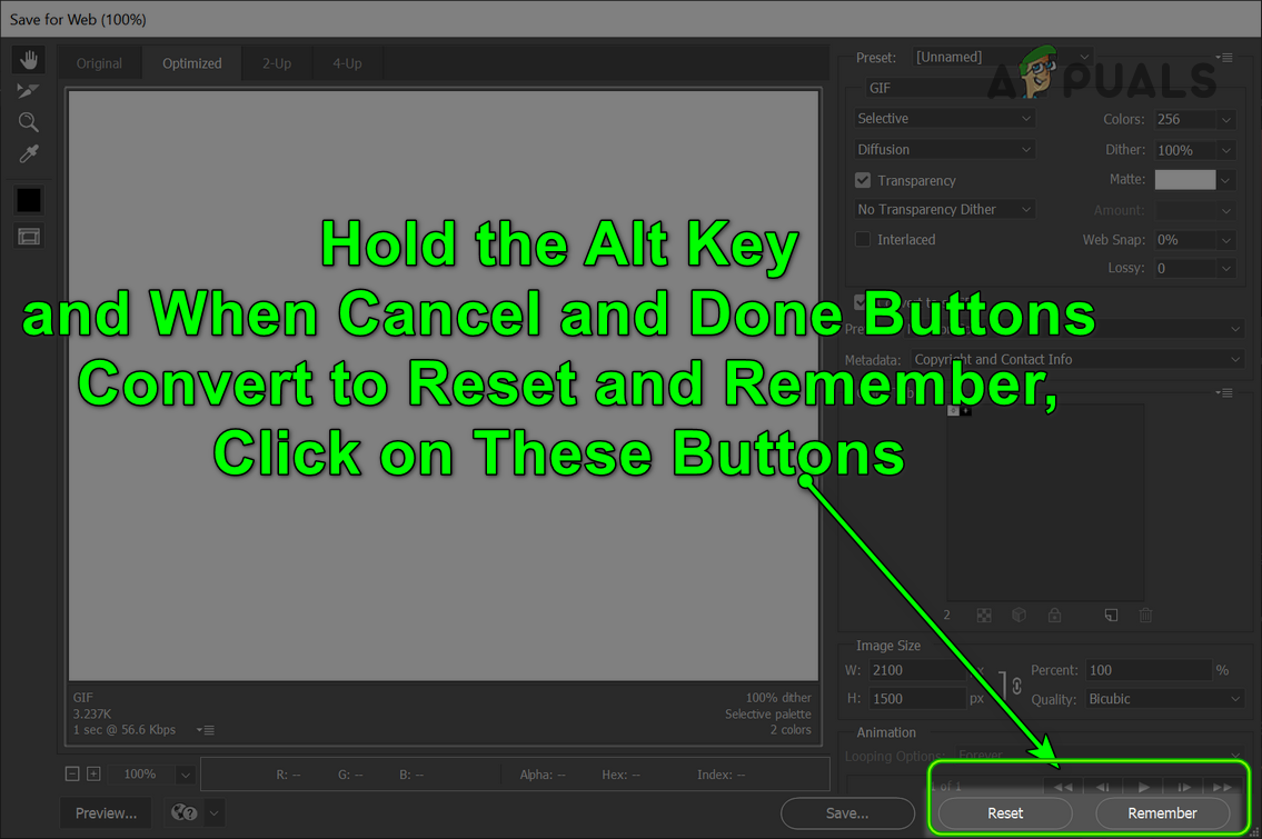 Click on the Reset and Remember Button in Save for Web Dialogue Box - If the issue is still there, then check if using the File>>Export>>Export As fulfills your requirements as this feature is intended to replace the Save for Web technology. The shortcut key for Export as on Windows is Alt + Shift + Ctrl + W and for Mac, it is Shift + Option + Command + W. Keep in mind this option has fewer features and may not come in handy in case of a file with animations.