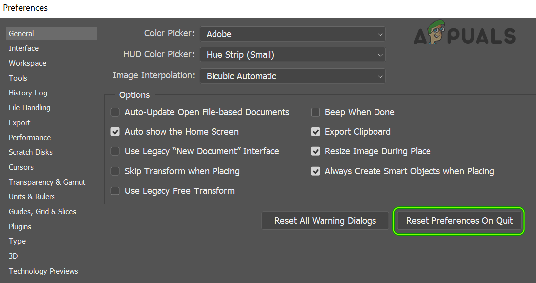 Reset Adobe Photoshop Preferences on Quit - Now relaunch the Photoshop application and check if the Save for Web error is cleared.