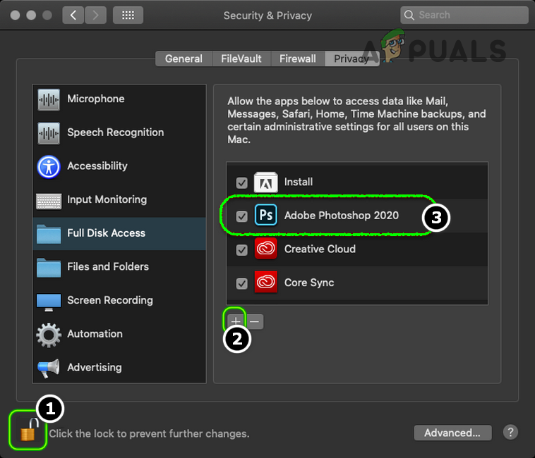 - Error in Full Disk Access Permissions to Adobe Photoshop: Adobe Photoshop requires Full Disk Access on a Mac to complete its save for web operation to the target drive. If the Photoshop application is missing the full disk permissions on Mac, it may show the save for web error.