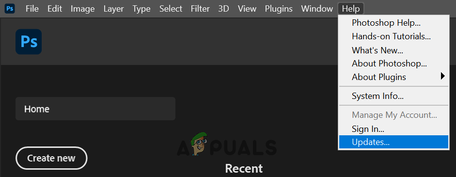 - Now select Updates and if a Photoshop update is available, follow the prompts to update the app. If you are using the Creative Cloud app, then you may use it to update Photoshop.