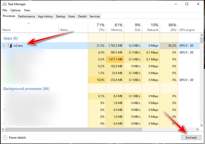 - Find cs2.exe, steam.exe, and (if present) steamwebhelper.exe.