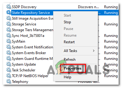 - Once you’re inside the Services screen, move down to the right-hand section and scroll down through the local services until you locate the State Repository Service. After you locate the service, right-click on it and choose Properties from the newly appeared context menu.