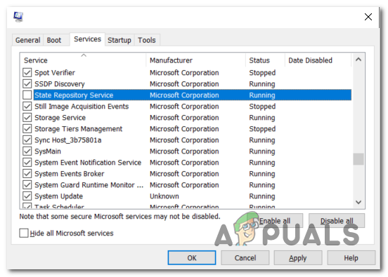 - After you manage to arrive in the correct menu, scroll down through the list of services and locate the State Repository Service. When you see it, uncheck the icon associated with it and click Apply to save the modification.