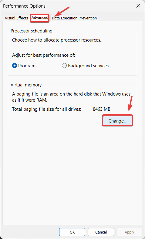 - Go to the Advanced tab > click Change under Virtual Memory.