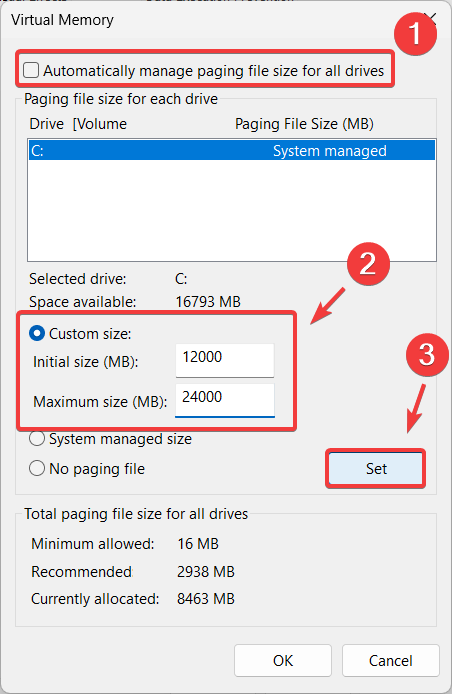 - Initial Size: 1.5 x your RAM (e.g., 12GB for 8GB RAM).