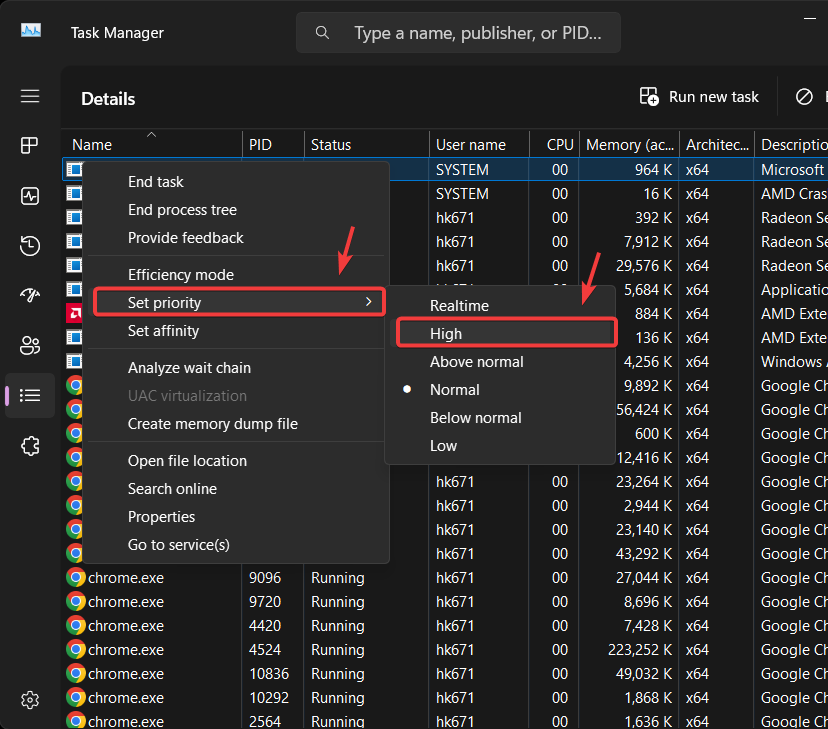 - Go to Details > right-click Assassin’s Creed Valhalla.exe > Set Priority > High.