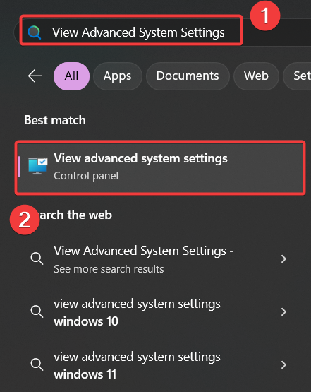 - Press Win + S, type View Advanced System Settings, and press Enter.